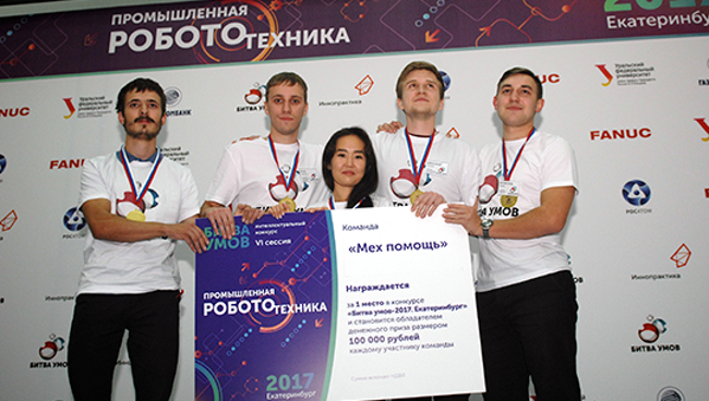 За первое место в конкурсе «Битва умов-2017. Екатеринбург» каждый член команды «Мех помощь» получил денежный приз размером 100 000 рублей.