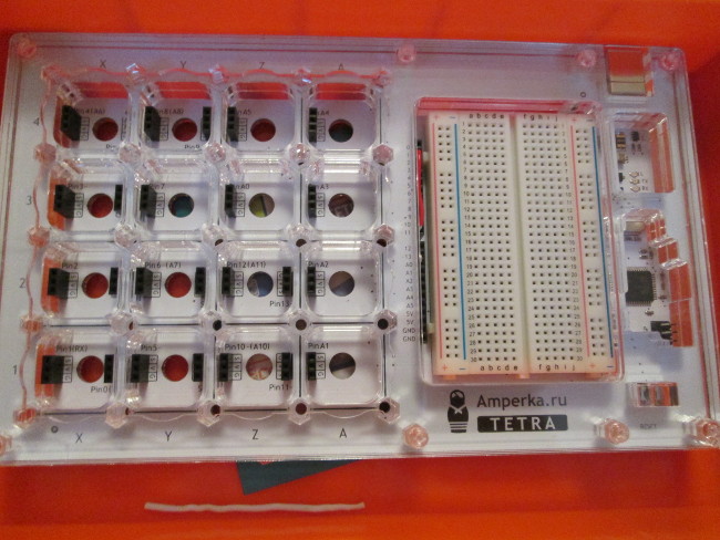 Это Лев и TETRA. Предлагаю вам статью, в которой хочу рассказать о наборе TETRA, это готовый курс для изучения основ программирования и электроники от компании Амперка.
