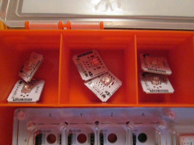 В первых трёх верхних ячейках лежат светодиоды: 2 красных, 2 жёлтых, 2 зелёных. Они особые, яркие. У них даже название «Пиранья». Вот так они выглядят.