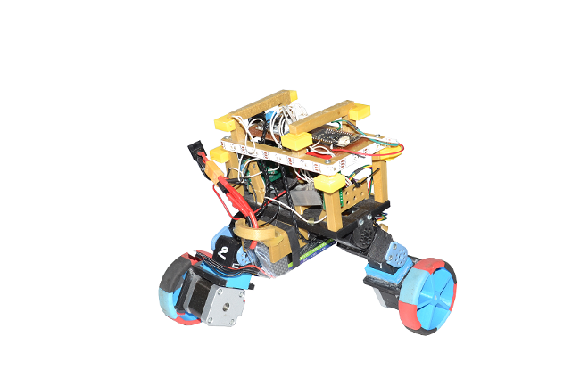 Балансирующий робот управляется с помощью пульта, может двигаться на двух ногах и корректировать свою «ходьбу» в зависимости от поверхности земли. Вместо ступней у него установлены колеса, благодаря которым он может подниматься из положения лежа.