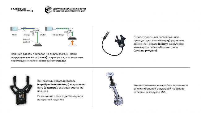Учёные создадут робототехнические системы и манипуляторы, состоящие из звеньев параллельного типа на основе скрученных нитей — twisted string actuators, TSA. Это позволит повысить полезную нагрузку подобных систем и точность управления ими. В приводах на основе TSA нить с одной стороны закреплена на двигателе, а второй её конец присоединён к рабочему органу или механизму, который перемещает полезную нагрузку. В результате закручивания нити сокращаются и приводят в движение рабочий орган.