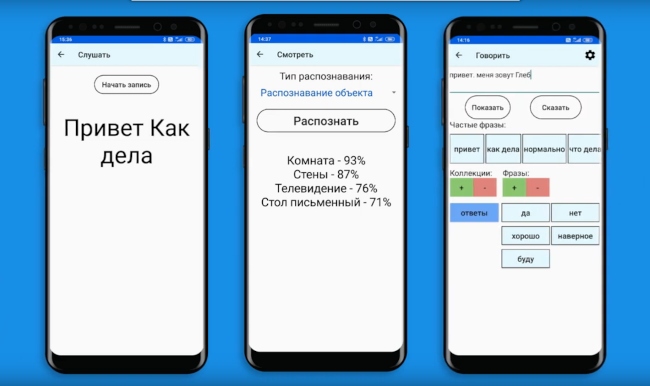 Вспоминая свою работу над проектом, Глеб сказал: «Я иногда слышал среди своих одногруппников в «IT Школе Samsung» подобную фразу: «Я не знаю, какое приложение мне написать». У меня не было сомнений. Моё приложение должно помочь людям с особыми потребностями полноценно общаться с миром, потому что данная проблема актуальна и в нашей стране, и в мире. И меня она лично касается. Есть много отдельных приложений: для синтеза речи, для искусственного зрения, для напоминаний и т.д. Мне хотелось объединить всё необходимое в одном приложении».